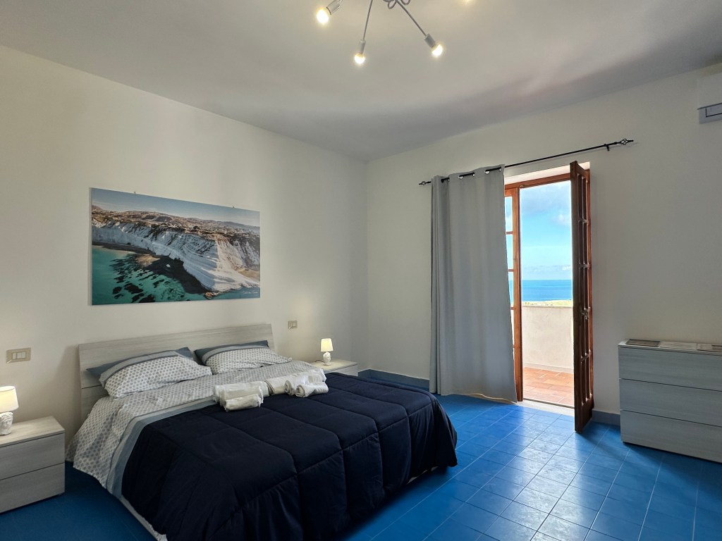 Camera luminosa con vista mare, caratterizzata da un elegante pavimento blu che richiama i riflessi del mare, per un soggiorno rilassante e pieno di charme.